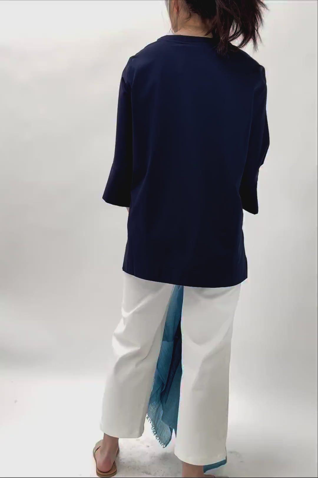 Easy and elevated, the Manda top is inspired by the understated details of our Mandarina shirt and constructed in our Italian cotton jersey material with Italian cotton poplin at the sleeve. The Manda Tee has a 3/4-length sleeve with a wide-cuff detail. It is a crewneck top with a high-low hem and a soft and relaxed fit, making it perfect for easy, everyday wear.